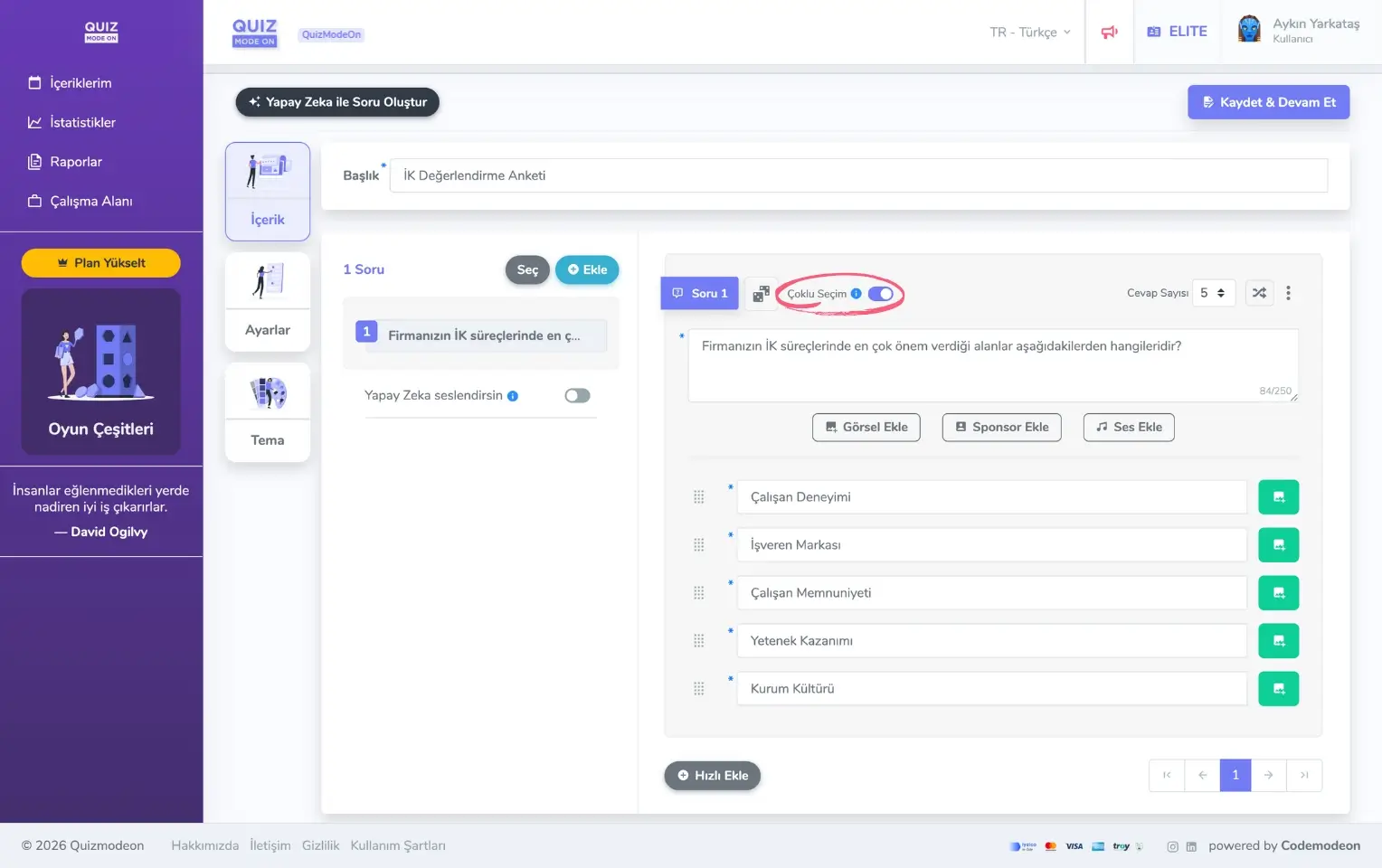 Dipnot: Yapay Zeka Seslendirsin butonu aktif iken soru veya cevapların değişmesi durumunda tekrar AI kredi harcanır. Bu nedenle, içeriğini finalize ettikten sonra Yapay Zeka Seslendirsin butonunu açmanı öneririz.